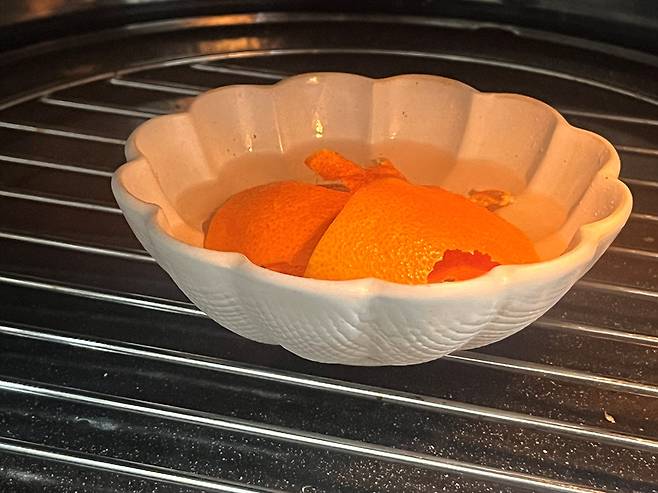전자레인지에 다양한 음식을 조리하다 보면 내부에 쾌쾌한 음식 냄새가 배는 경우가 있습니다. 그럴 때는 그릇에 물과 귤껍질을 넣고 전자레인지에 돌려 보세요.