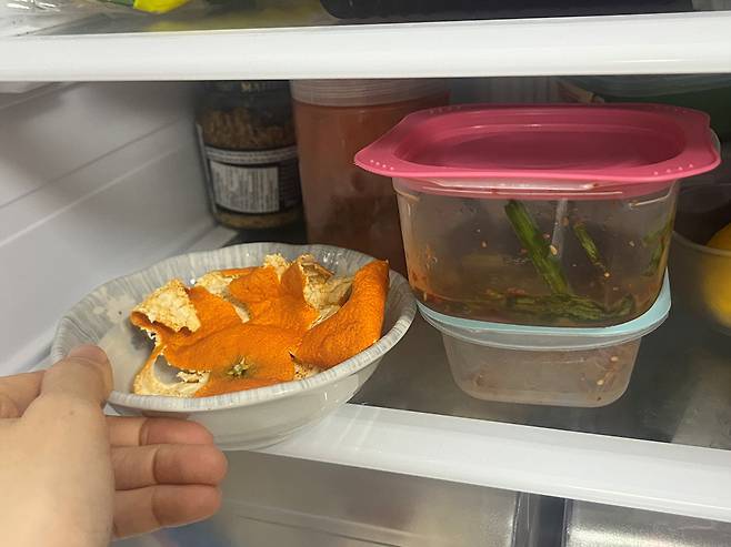 말린 귤껍질을 냉장고에 넣으면 악취 제거 효과를 볼 수 있습니다. 반찬통이나 김치통 옆에 말린 귤껍질을 비치해 보세요.