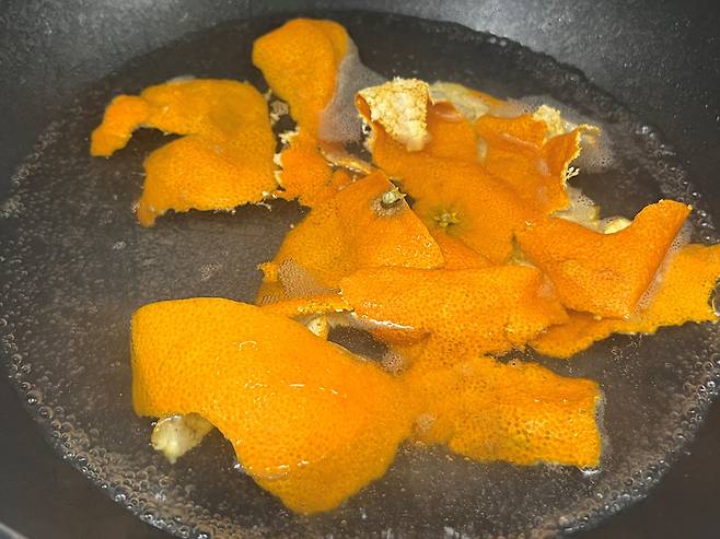 물을 따듯하게 데운 후 귤껍질을 넣어도 기름기를 제거하는 데 효과를 볼 수 있습니다. 팬에 물을 넣고 끓인 후 보글보글 끓으면 귤껍질을 넣어 보세요.