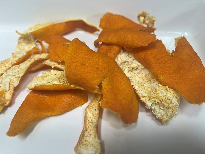 귤껍질은 바로 사용하지 않는 경우 이렇게 말려 놓아도 유용하게 사용할 수 있습니다. 자연스레 뿜어져 나오는 귤 향기로 천연 방향제 역할도 하니 절대 버리지 마세요!