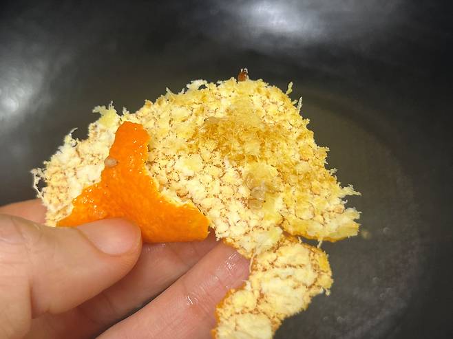 귤껍질은 팬에 묻은 기름기를 제거하는 데 활용할 수 있습니다. 키친타월 대신 귤껍질로 기름기를 닦아 보세요!