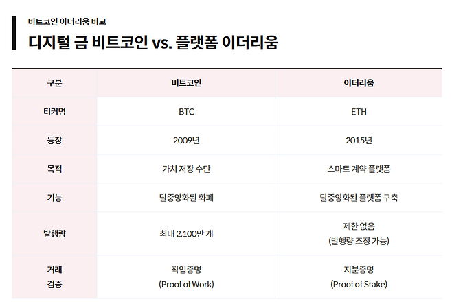 반면, 이더리움은 블록체인 위에서 '디지털 플랫폼'으로 다양한 서비스와 앱을 만들 수 있는 기반 기술이에요.