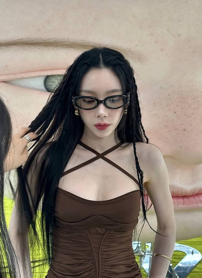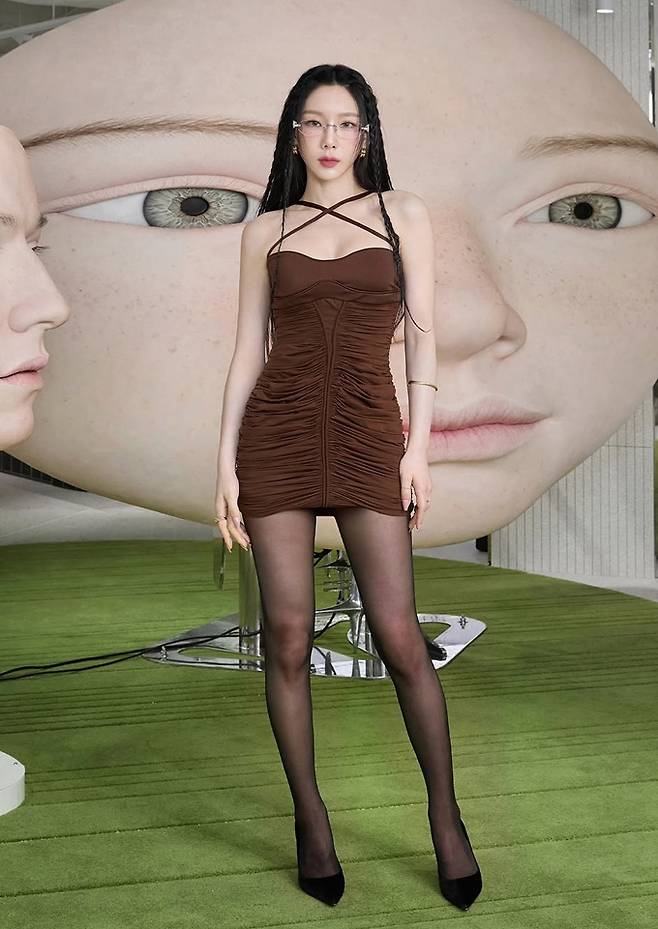 공개한 사진에서 태연은 긴 생머리에 직각 어깨와 쭉 뻗은 각선미가 드러난 브라운 컬러의 홀터넥 원피스로 160Cm와 45Kg의 가녀린 몸매와는 달리 탄탄한 반전 몸매를 과시했다.