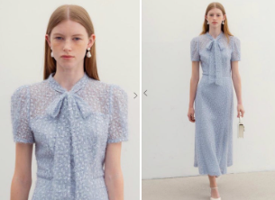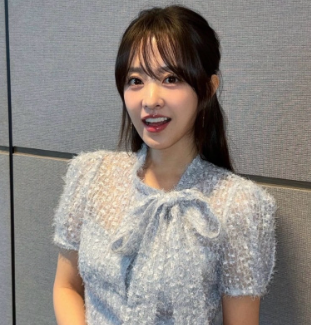 연하늘색의 깃털 소재의 레이스 리본 블라우스. 그녀의 사랑스러운 이미지와 정말 잘 어울리지?