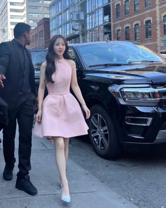 무릎보다 살짝 올라가 있는 길이감의 트위드 원피스로 트위드 소재의 고급스러우면서도 연한 핑크빛 색감으로 박보영의 사랑스러움도 담은 일석이조의 스타일링이야.