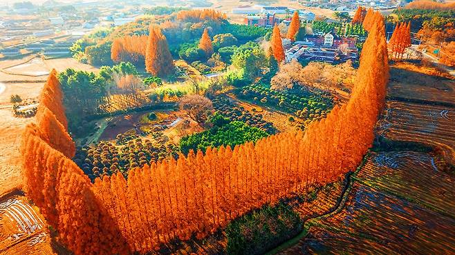 메타세쿼이아 숲길: 붉고 주황빛으로 물든 나무들이 병풍처럼 줄지어 서 있다.