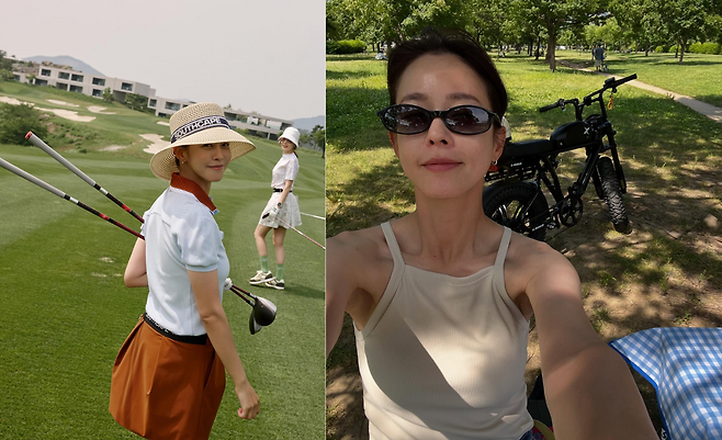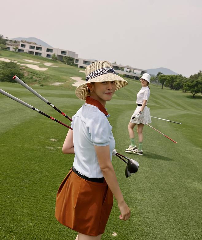 골프장에서는 화이트 폴로셔츠와 오렌지 컬러 스커트의 조합으로 스포티한 골프웨어를 선보이고 있다. 밀짚모자와 벨트로 포인트를 주어 기능성과 패션성을 모두 갖춘 스타일링을 연출하고 있다.