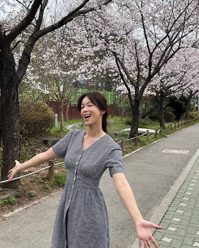 벚꽃이 만개한 봄날 촬영에서는 깅엄 체크 패턴의 랩 원피스로 로맨틱한 분위기를 연출하고 있다. V넥 라인과 허리를 강조하는 실루엣으로 여성스러운 매력을 극대화했으며, 체크 패턴이 주는 클래식한 느낌과 봄꽃의 조화가 인상적이다.