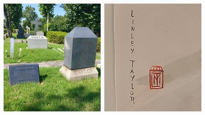 | ▲ 왼쪽 사진은 양화진 외국인 선교사 묘원에 있는 테일러 가족묘다. 그중 오른편에 보이는 큰 비석이 앨버트의 아버지 비석이고, 왼편의 작은 비석이 앨버트 테일러의 비석이다. 여름에 방문했을 때 사진을 짝어 두었다. 오른쪽 은 메리 테일러의 그림에 나오는 그녀의 서명이다. 자신의 이름 Mary Linley Taylor를 도장처럼 그려 놓았다. 집 모양은 분명 딜쿠샤를 생각하고 그렸을 것이다. 나는 이 서명에서 그녀의 감각과 타 문화에 대한 존중을 보았다, |