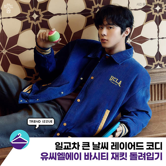 얼마 전 SNS에 바시티 재킷을 착용하고