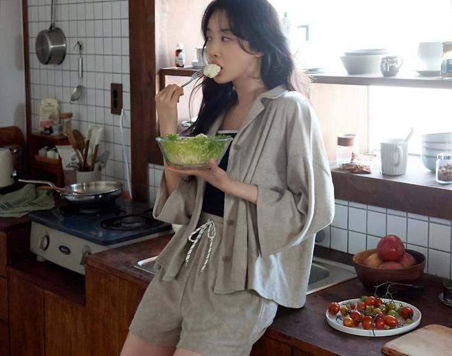 주방에서는 라이트 베이지 셋업에 올림머리를 하고 샐러드를 먹는 모습이 포착됐는데, 그 무심한 제스처마저도 스타일로 완성되는 느낌이었죠.