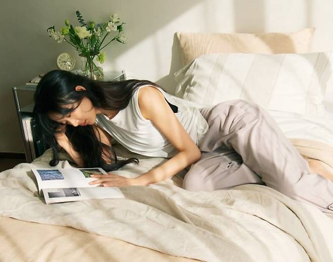 모노톤의 라운지웨어는 그녀의 고요한 성향과 닮아 있고, 단정한 실루엣은 일상의 한 장면을 하나의 장면처럼 정리해 보여줘요.
