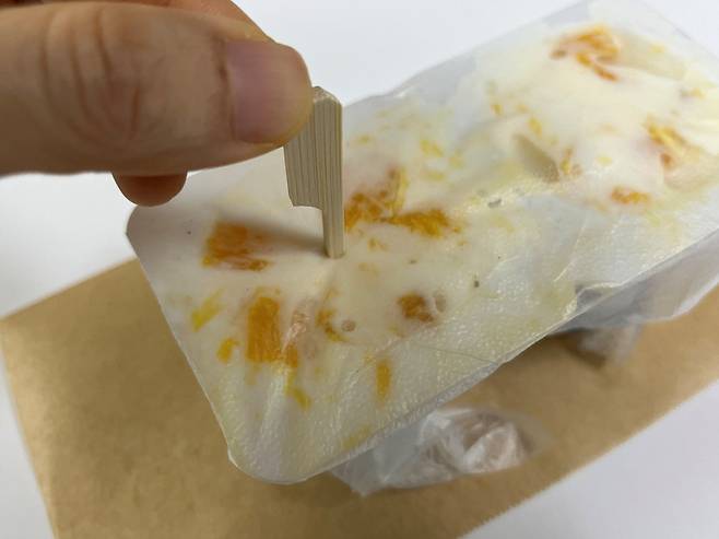 요거트 위에 랩을 씌운 후 나무 꼬지를 꽂아 줍니다. 이제 이 나무 꼬지가 아이스크림 막대 바 역할을 하게 됩니다.