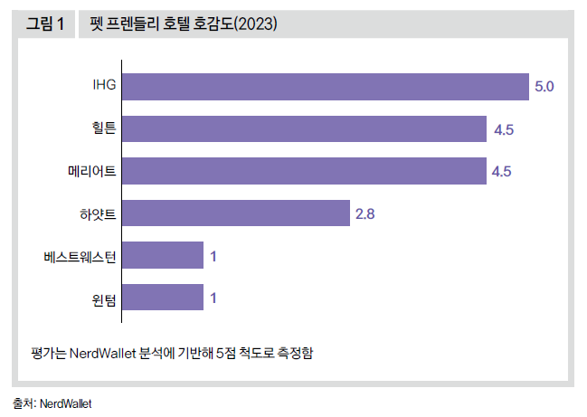 고급 호텔들도 펫 프렌들리 정책에 관심이 크다. 반려동물과 함께 숙박할 수 있는 룸과 식사할 수 있는 레스토랑을 구비하거나 반려동물과 함께 즐길 수 있는 자체 프로그램을 구성하고 있다. 이 중 IHG호텔 앤드 리조트가 가장 반려동물 친화적이라고 평가받는다.