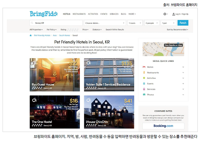 브링파이도(Bring Fido)는 이 같은 반려인들의 불편한 여행 경험을 해소해주는 미국 최대 반려동물 전용 여행 플랫폼이다. 전 세계 여행지의 숙박 시설이나 방문 장소에 대한 정보를 제공하는 부킹닷컴, 익스피디어닷컴처럼 브링파이도는 반려동물과 동반 여행을 꿈꾸는 반려인들을 위한 여행 정보를 제공한다.