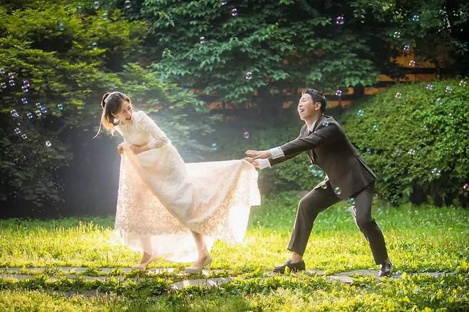 사진 속에서 김하영은 왼손으로 스커트를 살짝 들어 올려 드레스의 질감과 라인을 강조했다. 작은 동작 하나로도 전체적인 우아함이 배가되며 신부로서의 빛나는 순간을 담아냈다. 액세서리는 최소화해 과한 장식 없이 드레스 자체의 매력이 돋보였다. 귀에 작은 이어링만 착용해 은은한 포인트를 주었고 목걸이나 다른 장식은 배제했다. 화이트 톤의 부케가 더해져 단아하면서도 조화로운 분위기를 만들었다. 긴 생머리를 자연스럽게 늘어뜨린 헤어스타일은 청순한 이미지를 더했고, 화려한 업스타일 대신 단정한 연출을 택해 전체적인 조화를 이뤘다.