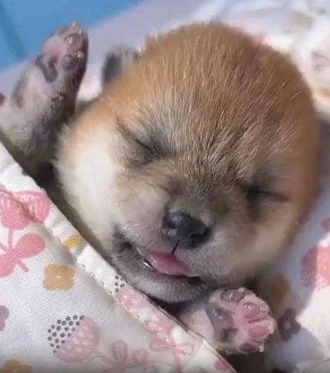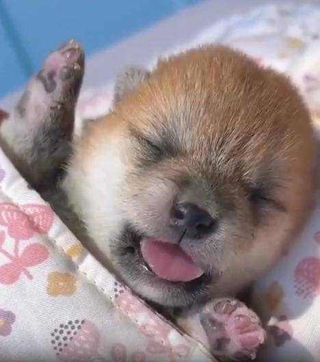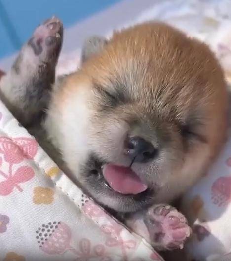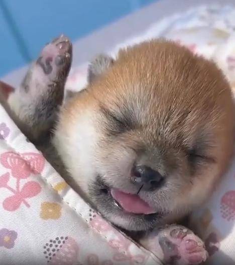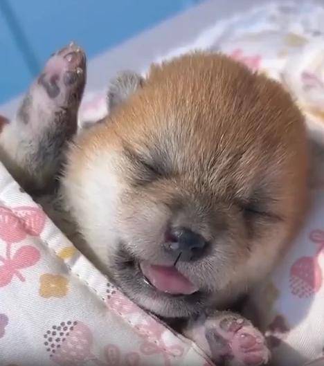 입을 살짝 벌린 채 포근한 잠에 빠진 아기 강아지의 모습