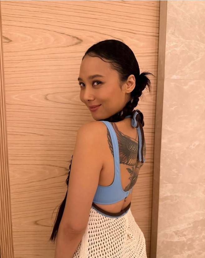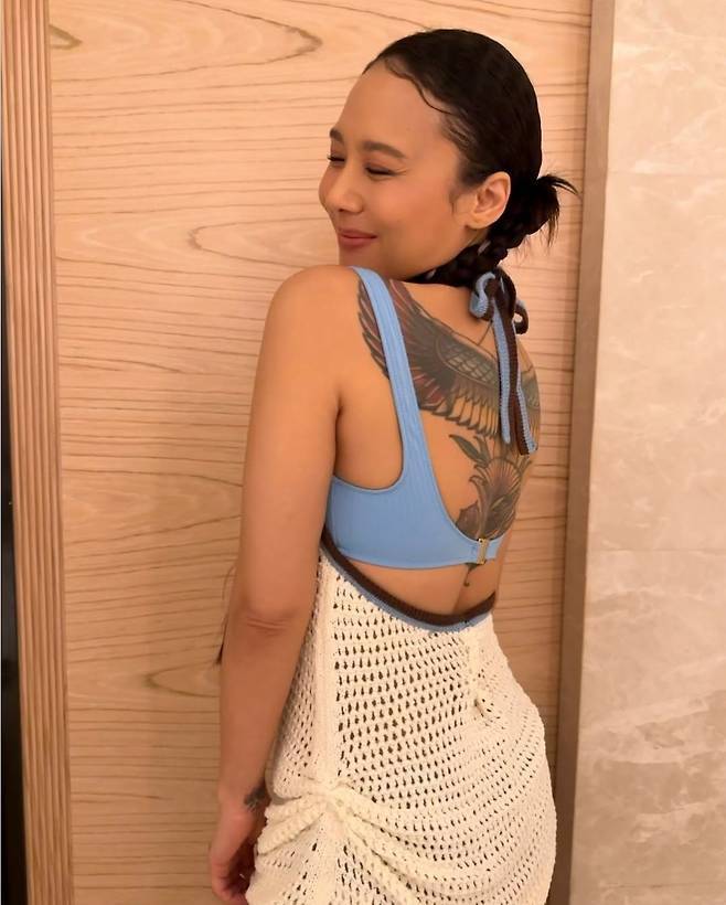여기에 타투와 자연스러운 포니테일 헤어, 그리고 밝게 미소 지은 얼굴은 '힙합 여왕' 특유의 자유로운 무드를 더욱 부각했습니다.