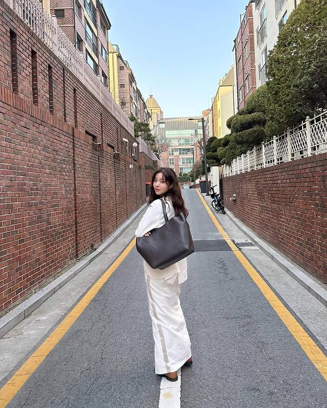 그녀의 옷차림은 단순히 예쁜 옷을 입은 것이 아니라, 자신만의 리듬으로 옷과 함께 걷는 모습이었다. 도심의 벽돌길 위, 하늘과 닮은 화이트 셋업이 햇살을 받아 더욱 밝아진다. 셋업과 가방, 그리고 그녀의 눈빛까지. 모든 요소가 어우러져 하나의 분위기를 만든다.