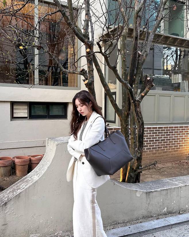 스타일링에서 특히 눈여겨봐야 할 점은 톤온톤의 조화다. 머리부터 발끝까지 비슷한 색감으로 통일한 뒤, 가방과 슈즈로 포인트를 준 방식이다. 단조로울 수 있는 화이트 컬러의 셋업이지만, 텍스처의 차이와 절제된 컬러감의 소품 덕분에 전혀 심심하지 않다. 여기에 그녀 특유의 부드럽고 자연스러운 웨이브 헤어가 더해지며 룩의 완성도를 끌어올렸다.