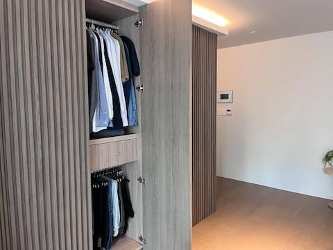 하지만 무엇보다 중요했던 건 옷장이 옷장같이 보이면 안 된다는 것! 그래서 이렇게 아무도 모르게!! 아트월처럼 보이게 수납장을 만들었어요. 덕분에 남편과 저의 옷, 가방 다 수납 되었답니다.
