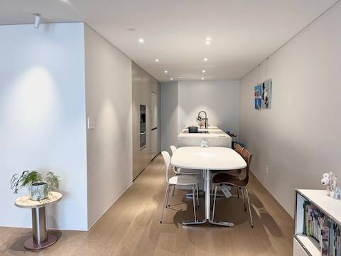 아일랜드 작업대 옆으로 식탁을 배치했더니 편리해요.