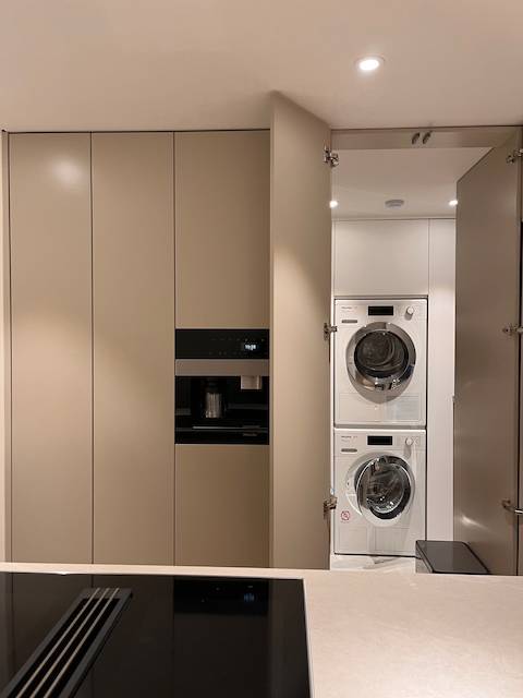 세탁기/건조기/김치냉장고/빨래감 등을 넣을 수 있는 공간을 따로 만들었어요. 지금 생각해도 너무 완벽한 주방! 세탁기, 건조기 소음이 생각보다 크더라고요, 문을 열고 닫을 수 있게 만들었더니 소음도 차단되고 무엇보다 급하게 손님 오시면 샤샤삭~ 넣고 닫음 감쪽같은 공간 ^^;