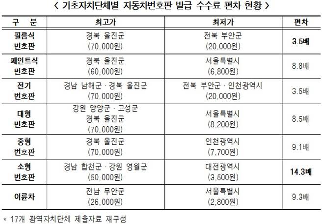 이어 중형번호판 9.1배(경북 울진군 7만원/인천시 7700원), 페인트식 번호판 8.8배(경북 울진군 6만원/서울시 6800원), 대형번호판 8.5배(강원 양양·고성군, 경북 울진군 7만원/서울시 8200원) 등 순으로 격차가 났다.