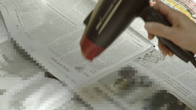 그리고 뜨거운 열기를 신문지에 쏘면 되는데요. 이때 주의할 점은 너무 오랫동안 뜨거운 바람을 쏘지 않는 것이에요. 약 1~2분 정도면 충분하답니다. 너무 오랫동안 하면 옷이 망가질 수 있으니 주의하세요.