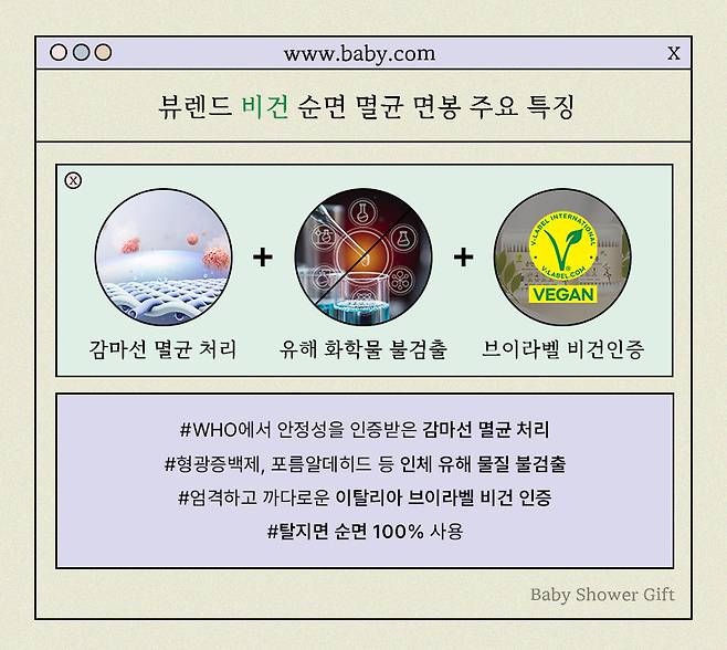 신생아 선물인 만큼 면역력이 취약한 아기에게 해로운 성분은 없는지 꼼꼼하게 확인하는 것은 기본 중의 기본이다.