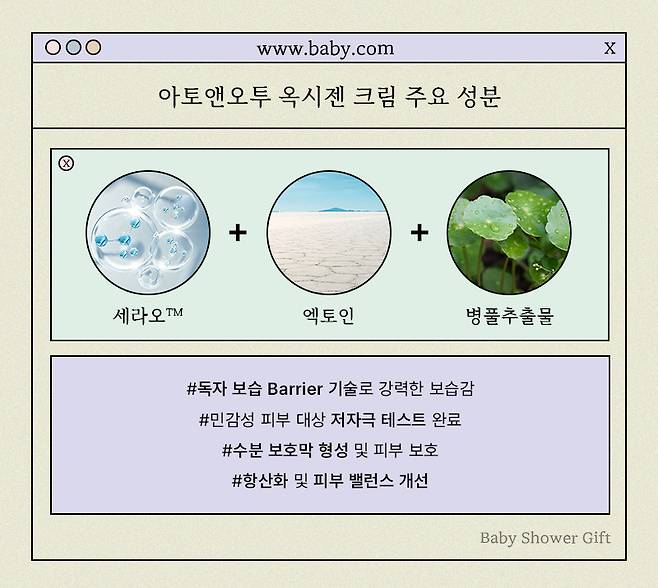 아토앤오투 옥시젠 크림은 건조하고 가려운 피부를 위한 신생아 보습 크림이다. 인체적용시험을 통해 100시간 보습 지속력 테스트까지 완료했다.