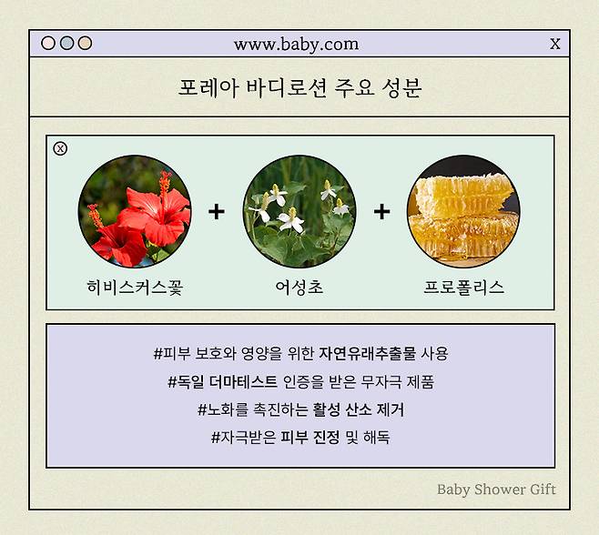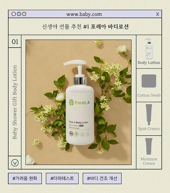 신생아 선물이 고민이라면 피부 타입 가리지 않고 온 가족이 사용할 수 있는 포레아 바디로션을 추천한다.