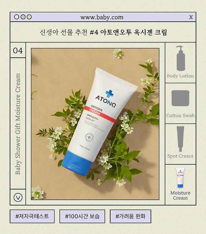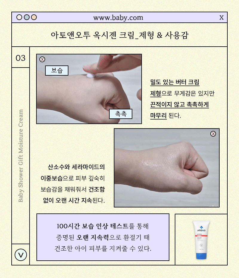 아토앤오투 옥시젠 크림은 건조하고 가려운 피부를 위한 신생아 보습 크림이다. 인체적용시험을 통해 100시간 보습 지속력 테스트까지 완료했다.