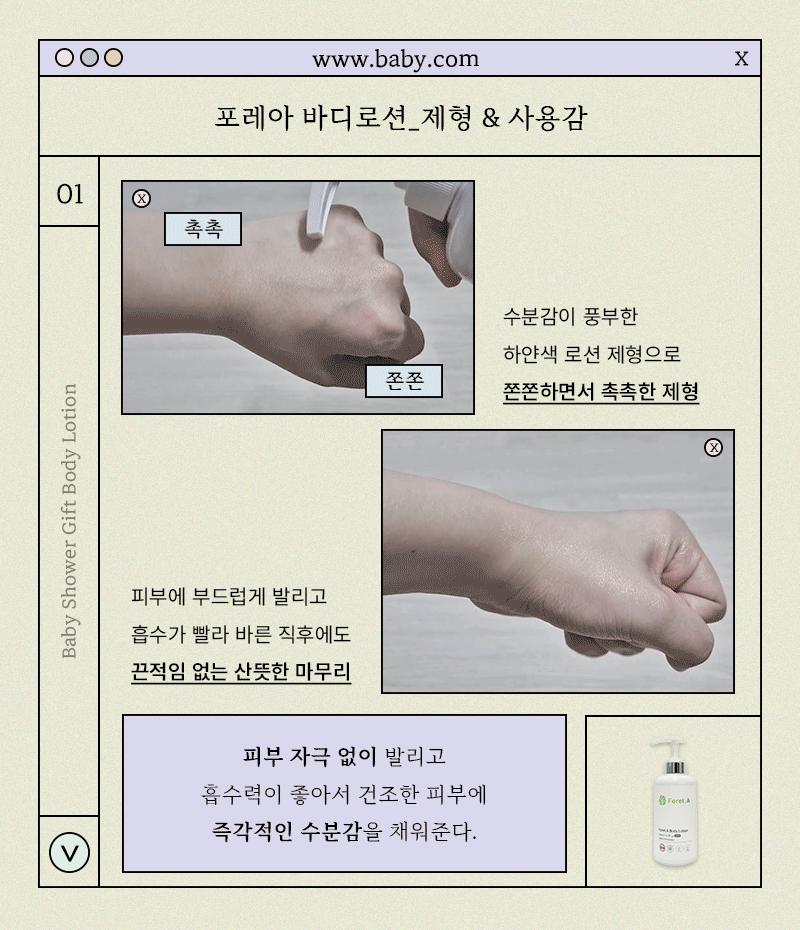 신생아 선물이 고민이라면 피부 타입 가리지 않고 온 가족이 사용할 수 있는 포레아 바디로션을 추천한다.