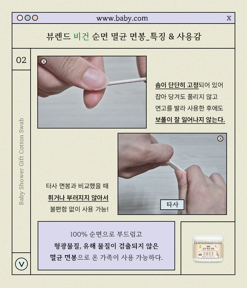 이처럼 높은 퀄리티의 뷰렌드 순면 멸균 면봉은 신생아를 위한 용도뿐만 아니라 수정 화장이나 얼룩 제거 등 다양한 용도로 사용할 수 있어 출산 선물에 센스 있게 얹혀주길 추천한다!