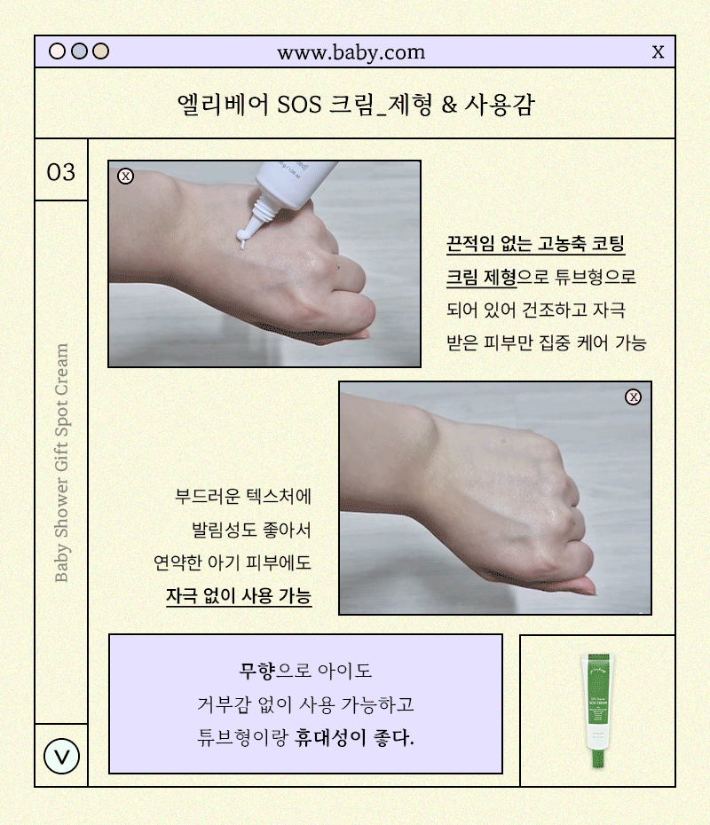 엘리베어 SOS 크림은 아기의 태열이 올라오거나 다른 피부질환이 생겼을 때 국소적으로 응급처치할 때 사용하기 용이하기에 앞서 소개한 포레아 온가족 바디로션, 뷰렌드 면봉과 함께 하나쯤 챙겨주면 센스만점 지인 등극.