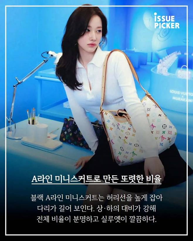๋ธ๋ A๋ผ์ธ ๋ฏธ๋์ค์ปคํธ๋ ํ๋ฆฌ์ ์ ๋์ฌ ๋ค๋ฆฌ๊ฐ ๊ธธ๊ฒ ๋ณด์ด๋๋ก ์ฐ์ถ๋์ด. ์์๋ ์์ด ๋ถ๋ช