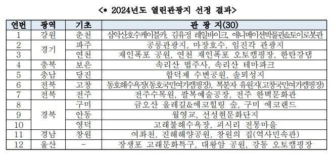 문화체육관광부는 한국관광공사와 함께 ‘2024년 열린관광지 조성 사업’ 지원 대상으로 12개 관광권역의 관광지 30개소를 선정했다. 20개소를 선정했던 지난해에 비해 150% 확대한 규모이다.