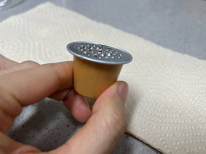 키친타월을 파우치처럼 접어서 커피가루가 밖으로 나오지 않도록 합니다.