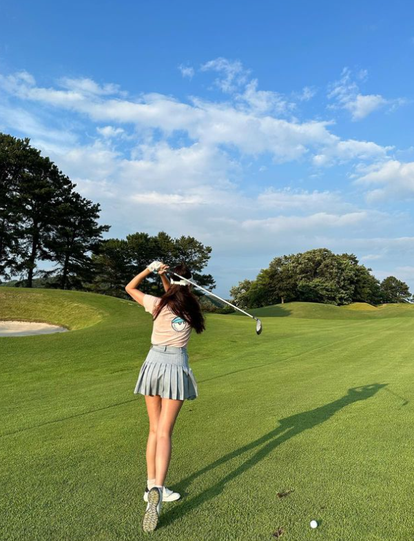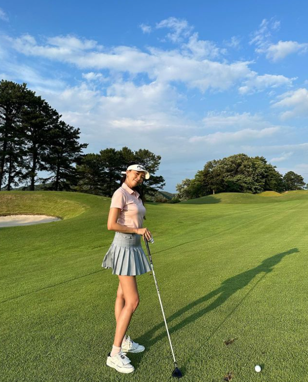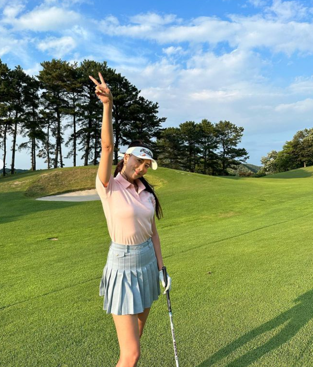 오윤아는 폴로티셔츠에 주름치마를 매치한 스타일링으로 눈길을 끌었다.
