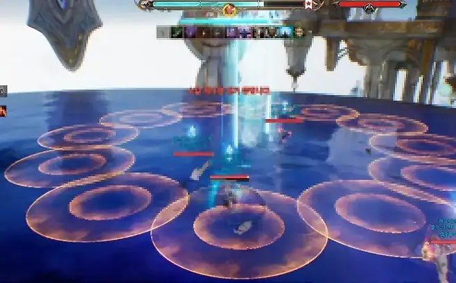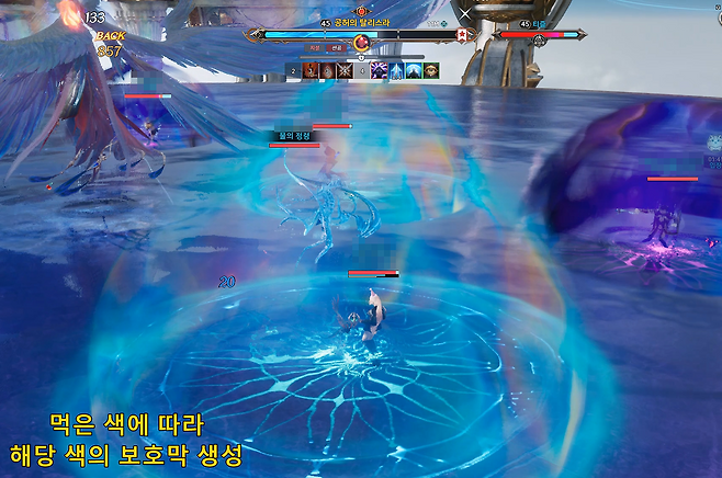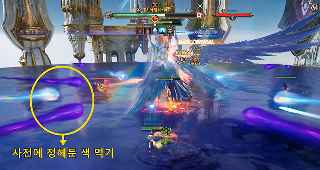 ✅색 순서 보호막 이동 - 보스의 무기 끝부분에 띄우는 색 순서대로 해당 색 보호막으로 이동 - 같은 색이 연속으로 나올 수도 있으니 순서만 잘 보고 이동