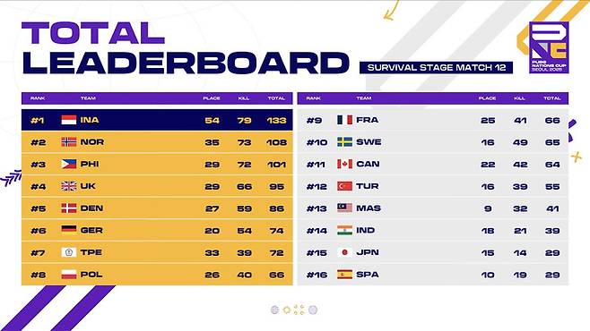 중국, 미국, 베트남 등 지난해 대회 성적을 바탕으로 직행한 강팀들이 합류하면서 총 16개국이 파이널 스테이지에서 맞붙는다. 파이널 스테이지는 오는 27일까지 3일간 하루 6매치씩, 총 18개 매치로 진행되며 킬 포인트와 순위 포인트를 합산해 최종 순위를 가린다.
