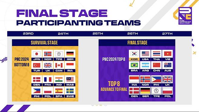 특히 PNC에 처음 출전한 필리핀은 공격적인 플레이로 깊은 인상을 남겼고, 덴마크와 폴란드는 막판 극적인 반등으로 파이널행 티켓을 거머쥐었다. 이 외에 영국, 독일, 차이니즈 타이페이가 상위 8위권에 이름을 올렸으며, 프랑스와 일본 등 하위 8개 팀은 탈락했다.
