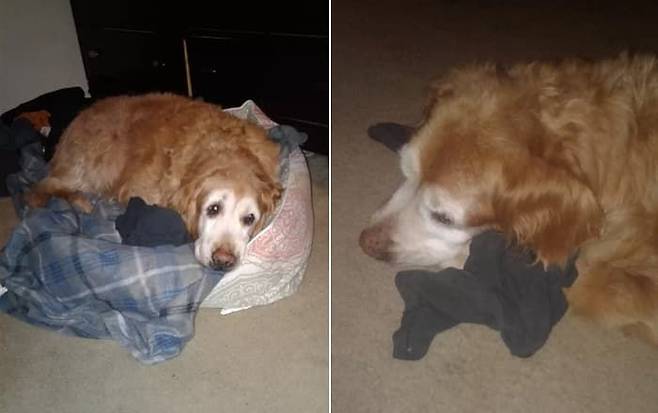 툭하면 아빠가 입고 벗어놓은 셔츠나 바지 등 옷에 얼굴을 파묻고 잠든 골든 리트리버 강아지 몰리.