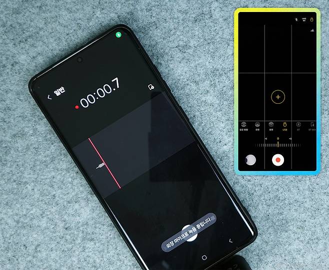 스마트폰에서도 USB 외장 마이크로 표현되며, 갤럭시 스마트폰에서는 음성 녹음과 프로 카메라에서 정상적으로 동작하고 있는 모습을 확인할 수 있었습니다.