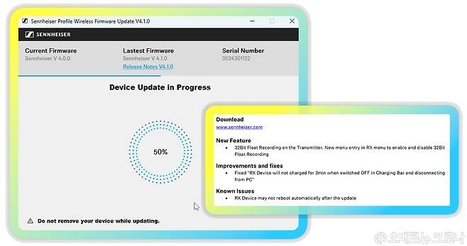 또, 젠하이저의 경우에는 펌웨어 업데이트를 통한 확장 기능을 제공하고 있는데요. 펌웨어를 v4.1.0 버전 이상으로 업데이트할 경우, 32bit float 레코딩 기능을 지원하며, 이외에도 여러 이슈에 대한 피드백을 제공하고 있으니, 업데이트 내역을 확인하시면 되겠습니다.