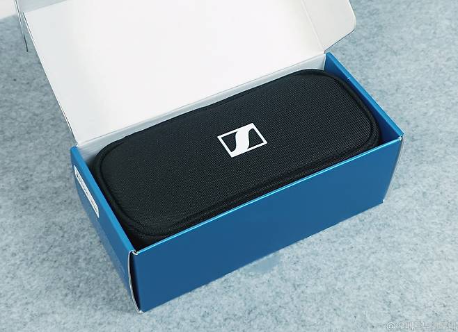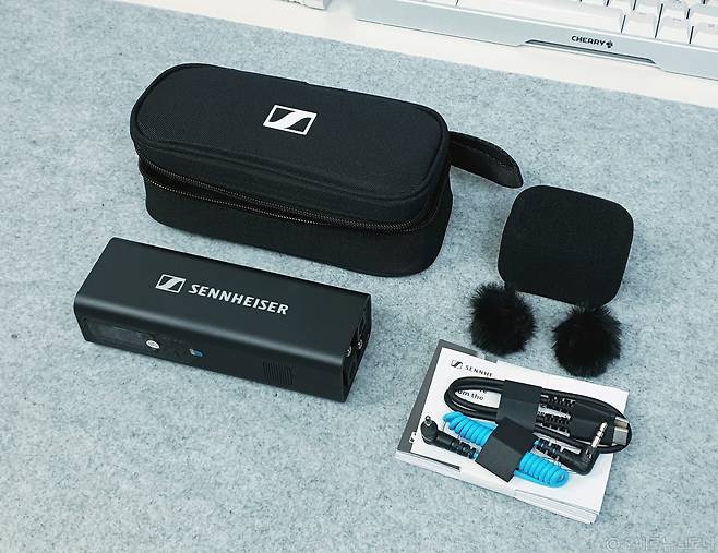 젠하이저 PROFILE WIRELESS SET는 프로페셔널한 올인원 촬영 장비 키트로서, 포장 역시 상당히 정갈하게 진행된 모습을 확인할 수 있고, 구성품으로는 충전 케이스와 이를 보관할 수 있는 휴대용 파우치, 2.4GHz 수신기, 2개의 송신기 무선마이크, 및 촬영용 액세서리가 포함되어 있는 모습입니다.