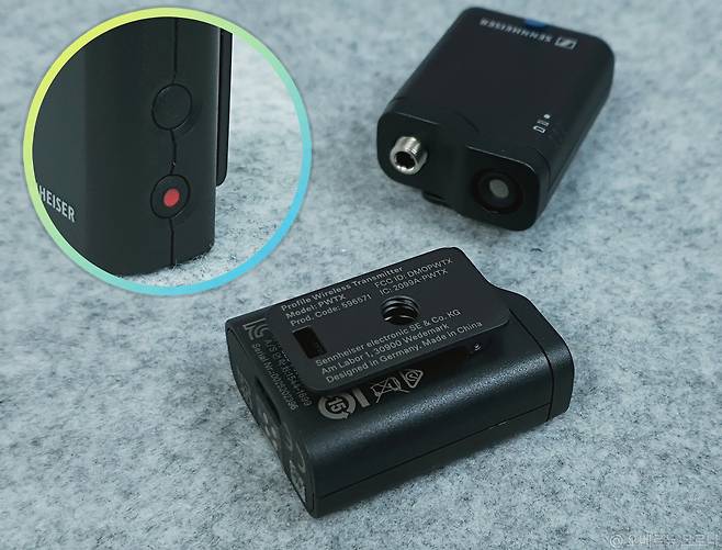 각 구성품은 정밀하게 가공되어 있고, 단단한 소재와 마감 처리로 장시간 사용과 실외 촬영 등에 내구성 걱정이 없는데요. 먼저 송신기(TX) 무선마이크를 살펴보면, 약 5cm 남짓한 소형 크기의 클립형 핀마이크 형태로 제작되었으며, 송신기 자체에서 음소거 등을 제어할 수 있도록 전원 밑 녹화 버튼을 설계했습니다. 무광 처리된 외관은 곡선형 테두리로 부드럽게 디자인해, 노출 시에도 군더더기 없고, 마이크 클립을 사용해, 옷깃이나 가방끈, 노트북 등에 무리 없이 고정이 가능한데요. 마이크는 수음부를 하우징 안쪽으로 매립해 마찰음을 줄일 수 있도록 했고, 전방향 수음 특성을 지녀, 말하는 방향이 자유로운 브이로그 환경에 적합한 모습입니다.