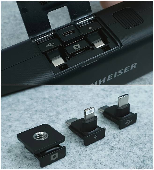 충전 케이스는 송신기와 수신기 수납은 물론, 결합할 수 있는 액세서리를 보관할 수 있도록 꾸몄는데요. 수신기에는 콜드 슈 마운팅 어댑터와 USB 커넥터를 결합할 수 있으며, 라이트닝 8핀과 C 타입 커넥터를 제공해, 아이폰과 갤럭시 스마트폰 등 휴대기기에도 연결해 사용할 수 있도록 했습니다.