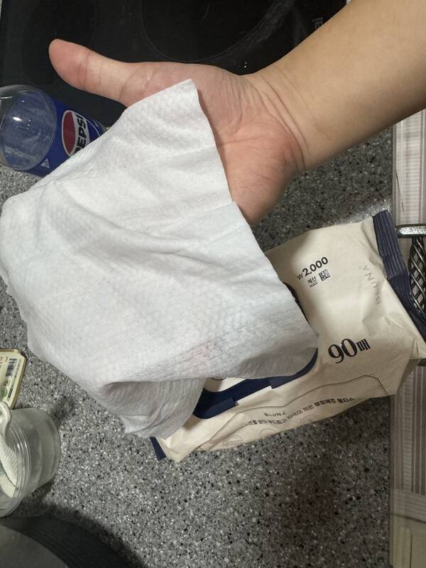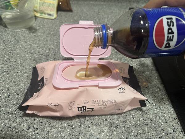 5~10분 정도 두면 물티슈가 부드러워지고 콜라가 잘 스며듭니다.